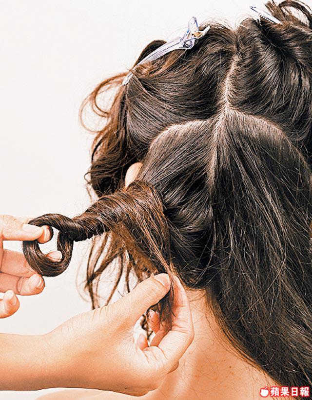 1.準備一支熱捲器,從頭頂開始捲,約3至4圈,待約5秒,取出熱捲器。想鬈髮自然,捲好後所有頭髮撥後,可用手摷鬆頭髮。
