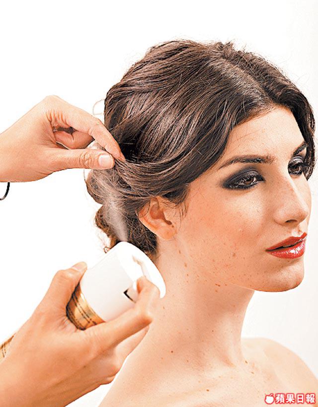 4.前額兩邊頭髮,噴上定型噴霧,往後輕撥,形成自然的弧度。