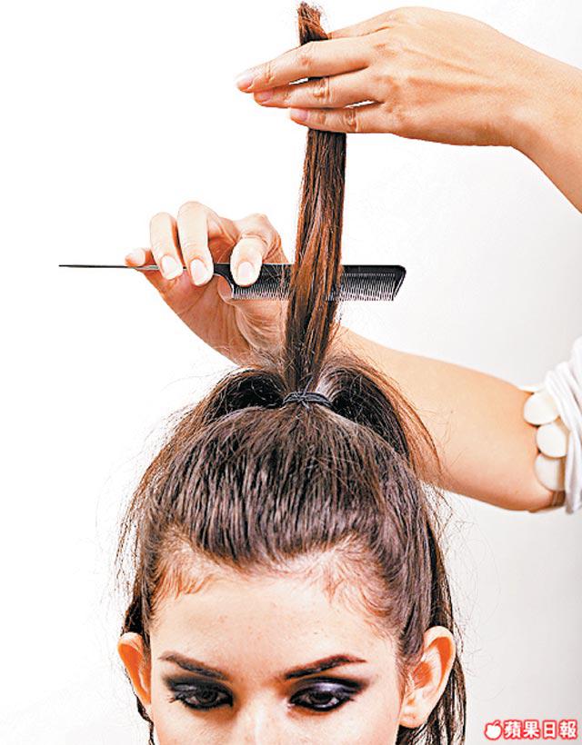 1.把頭髮梳順,將所有頭髮集中於頂頭位置,紮成一大束馬尾。