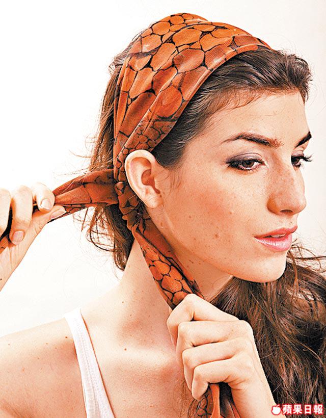 2.將所有頭髮撥向一邊,摺好粗粗的頭巾戴上,然後隨意在耳後打結。