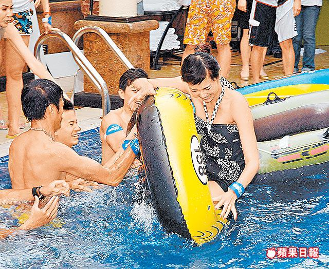 玩遊戲時楊秀惠被眾男隊員拖落水,所以監製即場懲罰眾壯男,要求他們一字排開站在泳池邊讓女藝員踢落水。思琦昨日一件低V泳衣可算搶盡風頭,並謂已做足安全措施。昨日適逢阿佘正日生日,工作人員特別預備大蛋糕替她慶祝,剛巧黃長興遲到,故被眾人要求以法式濕吻賀阿佘,但他只輕吻她的臉頰一下。