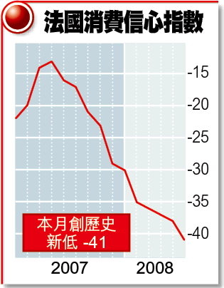受高油價打擊,法國本月消費者情緒指數由負38降到負41,是該指數於87年面世以來最低,且低於預期的負37。GlobalInsight經濟師伊斯卡羅說,隨着燃料漲價,加上信貸收緊、樓市放緩和經濟前景欠明朗,預料當地消費開支在可見將來會持續疲弱。
