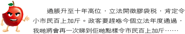 政客為求推出一啲政治正確嘅措施,可以唔講道理、唔理市民喺高通脹之下嘅感受;例如噚日通過嘅食品標籤法,就會令好多由東南亞等地直接入口嘅廉價食品絕迹於市場,但偏偏政客就充耳不聞。下一步,政客又準備通過令市民百上加斤嘅膠袋稅……