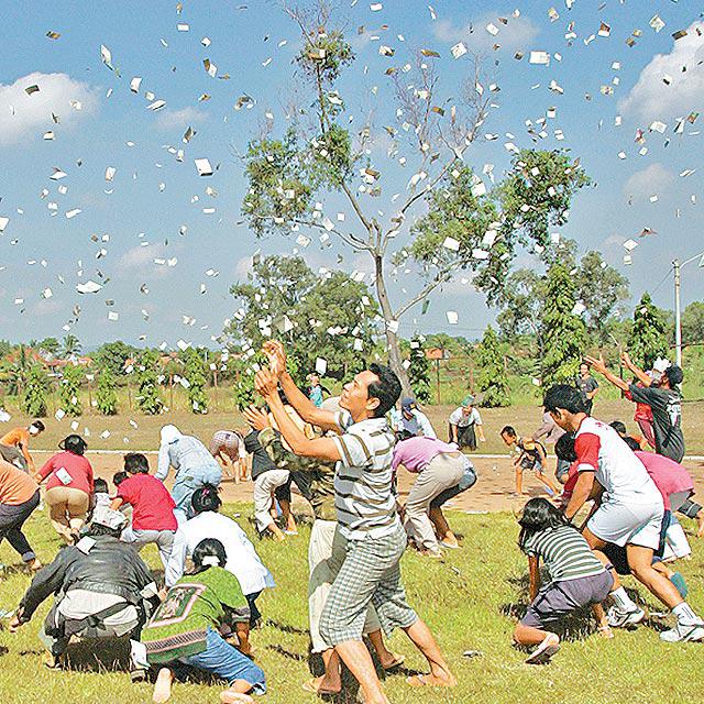印尼有商人坐飛機大灑銀紙(圖一),總值1億印尼盾(約83,000港元)。商人韋林金(TungDesemWaringin)昨天(周日)坐飛機四次經過西冷市(Serang)一個足球場上空,大灑面額1,000和5,000印尼盾,有些跌在球場上,有些飄到球場外500米。大批居民在場檢拾(圖二),一名13歲少女追錢時昏迷。韋林金派錢全為宣傳第二本商業著作,他說與其出錢做宣傳,倒不如把宣傳費派給有需要的人。 路透社/美聯社