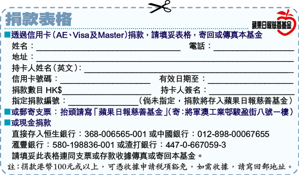 蘋果日報慈善基金接收捐款戶口 恒生銀行:368-006565-001 中國銀行:012-898-00067655 滙豐銀行:580-198836-001 渣打銀行:447-0-667059-3 蘋果日報慈善基金 電話:29908688 傳真:37112468 電郵:mailto:[email protected] 網址: http://charity.atnext.com 捐款: http://charity.atnext.com/forms