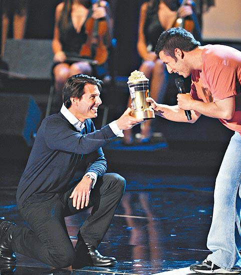 至於與妻子姬蒂荷姆絲(KatieHolmes)結伴前來的湯告魯斯(TomCruise),昨日跪地頒發世代大獎給以一身牛仔褲和T恤亮相的諧星阿當桑廸拿(AdamSandler),當晚阿當還手執結他獻唱占士邦電影主題曲《NobodyDoesItBetter》送給駐中東美軍,贏得全場掌聲。