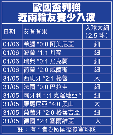 另外,16支歐國盃決賽周參加球隊的備戰工作進入最後階段,但從過去兩輪友賽所見,10場比賽開出了3「大」7「細」(見附表),反映各參賽隊在臨近歐國盃展開之前(本周六正式開波)不想有任何差池,故周三西班牙於主場對友賽美國,宜向入球「細」埋手。
