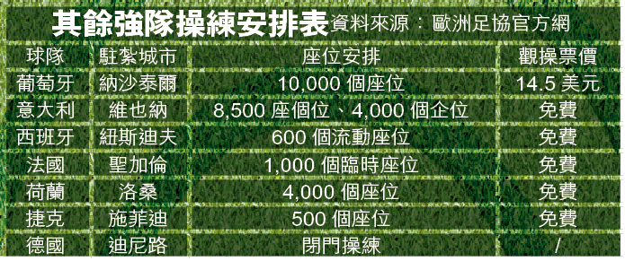 葡萄牙的公開操練是唯一收門票的球隊(見附表),14.5美元更被炒高至4倍,難怪葡萄牙傳媒驕傲地形容「只有巴西有這樣的待遇!(06年巴西隊在瑞士備戰世界盃入場觀操費為16美元)」然而,原本1萬人入場的安排,也隨着人潮而調整至12,000人(一樣爆滿),這是納沙泰爾隊平均入場人數的兩倍。