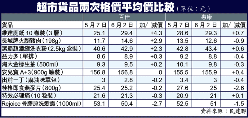 【本報訊】超市價格大上小落。民建聯師奶格價兵團比較百佳及惠康兩大超市10種貨品過去一個月的價格變動,發現百佳出售的長城牌火腿豬肉(198克)及維達廁紙10卷裝(3層),短短一個月內價格分別勁升25%及17%;但其他減價貨品的減幅只得「一個幾毫」。民建聯形容部份貨品極速加價一、兩成,令人難以接受。