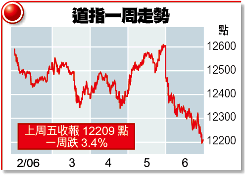 道指周五最多跌412點或3.27%,收報12209點,跌394點,是07年2月以來最大跌幅。納斯達克綜合指數挫75點,收報2474點;標準普爾500指數則跌43點,收報1360點,跌幅分別為3%及3.1%,均為4個月最急跌勢。全周計,道指跌3.4%,標普500縮2.83%,納指跌1.9%。