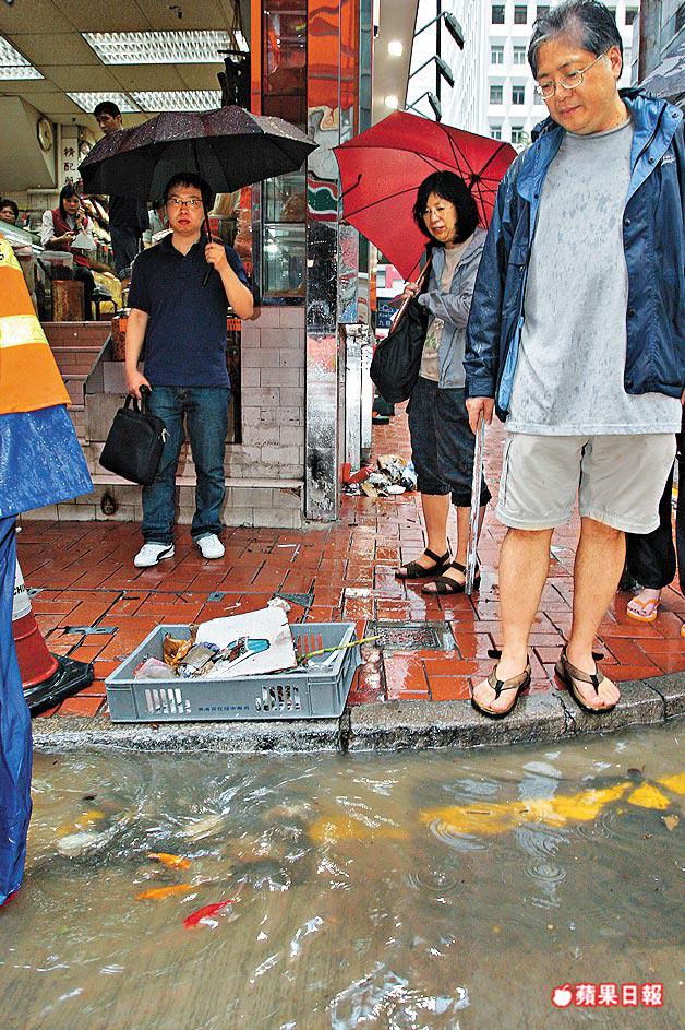 上環永樂街水浸期間,水中竟有金魚及熱帶魚暢游,這些魚來自附近孖沙街一個水族檔。早上水浸最嚴重時,老闆梁先生返回店舖發現已被洪水淹浸,舖內低處魚缸的魚全部走掉,至少有數百條估計損失3萬多元。