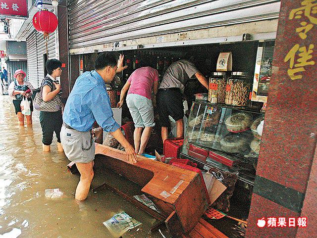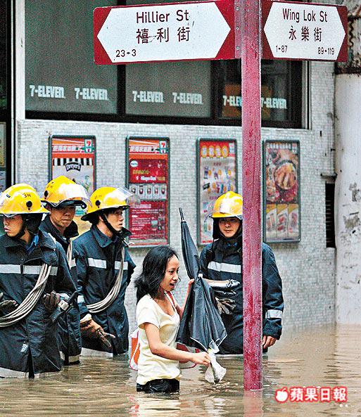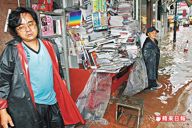 中環禧利街與文咸東街交界一個報紙檔,檔主岑先生早上6時開工,在黑色暴雨時,他眼見水浸越來越高卻無能為力,眼巴巴看着報紙雜誌全被浸濕。他無奈地說,該處每年都會水浸,今次就特別嚴重:「以前浸到腰,今次浸到心口,再咁浸法我就死啦。」