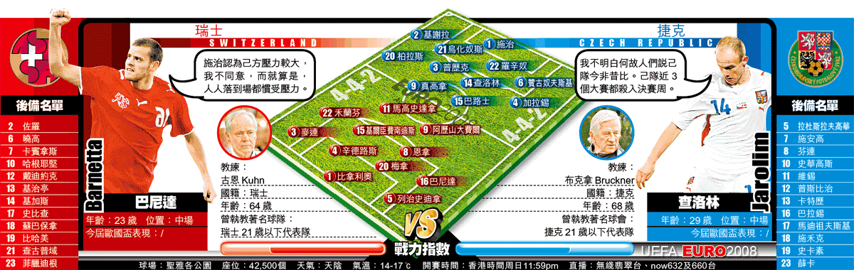 假如逐個秤的話,捷克戰力應略勝瑞士,問題是路斯基避戰今屆賽事,而尼維特又拒絕出山救亡,中場欠缺一位可扭轉亁坤的大將。從教練布克拿幾番力勸尼維特助拳看,是自知球隊戰力不足的明證。