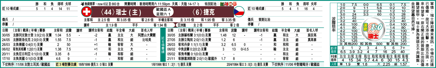 睇盤,瑞士周六對捷克有主場之利都開平手盤,看似信心度不足,惟最近頻頻在熱身賽贏波的捷克,欠缺靈魂人物之餘,前線又食老本,這場歐國盃A組揭幕戰,平手盤捧瑞士坐和望贏。(球賽編號:星期六1;無綫翡翠台、now632及660台今日11:59pm直播)