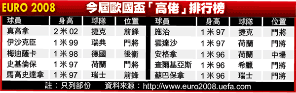 以2米02高度傲視歐國盃一眾參賽球員的真高拿,一向以「高人一等」見稱,而他帶領的捷克將於首戰面對有1米97的「高佬」中鋒馬高史達拿。除兩人外,今屆歐國盃最高球員的頭10位(見附表)有4人來自兩隊,名副其實是「高佬對決」。