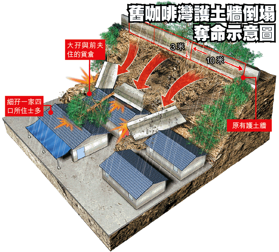 至清晨6時許暴雨連場,村屋後一幅護土牆突然傾塌,一幅3米x10米,重20噸的石屎塊將大孖與前夫住的貨倉壓毀,兩人慘被活埋。隔鄰安記士多練姓東主聞巨響出外查看,即拍門通知仍在睡夢中細孖一家。細孖表示當時完全聽不到塌牆聲,她邊哭邊說:「我都聽唔到,安記走嚟拍門通知話塌山泥,我哋先知有事,走出嚟見到家姐間屋已塌晒。」