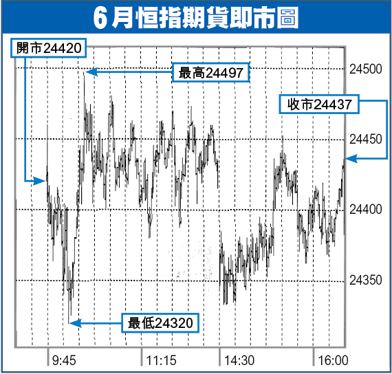 期指以24420高開,挾高至24497後回吐,但未有完全回補即日裂口,尾市反覆回升,以24437收市,升207點,轉高水35點。