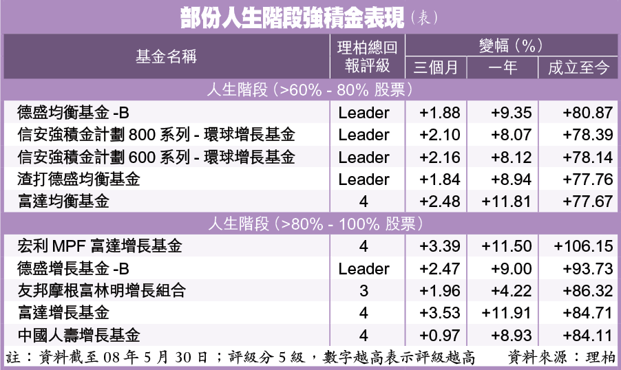 蕭美鳳建議何太可考慮重新分配投資比重,70至80%為股票基金,其餘為債券及保本資產,進取的話可揀高風險的區域性股票基金,如香港、中國及亞太地區等股票基金,博取更高回報。否則,何太亦可考慮人生階段系列,選股票佔60%或以上的成份基金(見表)。