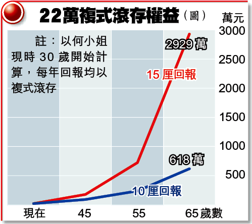 事實上,何太不應忽視複式效應威力,現有投資組合即使不再供款,若以年回報率10厘累積滾存,65歲時(35年後)戶口總值將達618萬元;以年回報率15厘計算,總值更達2929萬元(圖)。假設退休後投資回報等於通脹,618萬也可維持現時每月1萬元的生活水平,應付退休生活至85歲。