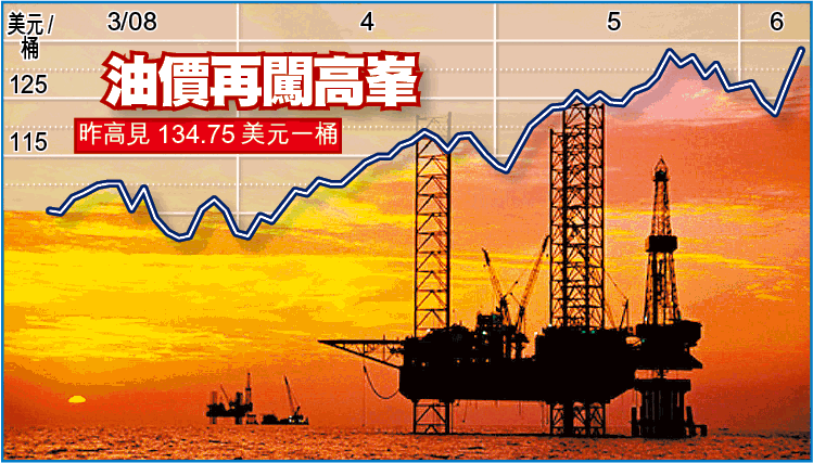 紐約期油一度漲6.96美元(5.45%),至每桶134.75美元,與135.09美元的歷史高位僅差34美仙;倫敦布蘭特期油最多升6.46美元(5.07%),見134美元。截至今晨零時,紐約期油報每桶134.4美元,升6.61美元;布蘭特期油報133.6美元,升6.06美元。