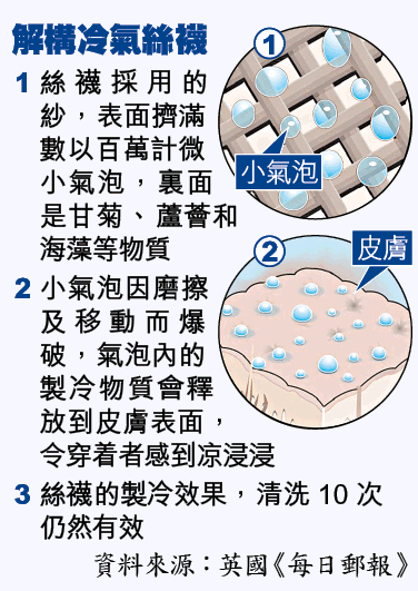 冷氣絲襪的蹺妙,在於質料採用革命性的日本紗,內藏數以百萬計的細小氣泡,氣泡裏面全是甘菊、蘆薈和海藻等具冷卻皮膚作用的物質。女士穿着冷氣絲襪時,氣泡會因磨擦而爆破,裏面的物質就會釋放到皮膚,起製冷作用,令穿着者雙腿凉浸浸。冷氣絲襪的製冷效果,清洗10次仍然有效,每對售4英鎊(約62港元)。