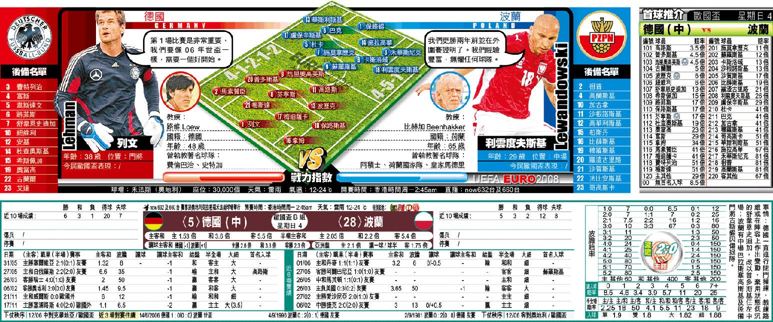 08年歐國盃奪標大熱德國周日出場,於奧地利克拉根福的禾法斯球場,與波蘭進行B組分組賽。德軍實力在波蘭之上,加上近屆在決賽周首戰少失拖,料可旗開得勝,熱捧德國W,兼取「讓球主客和」[-1]「主勝」。(球賽編號:星期日4;now632及660台明日2:45am直播)吾中