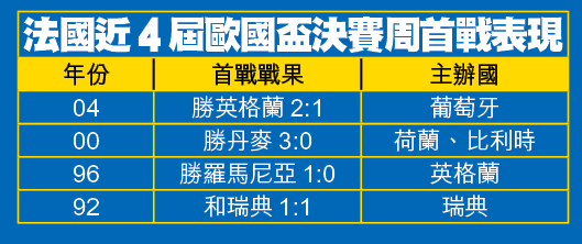法國近年均是大賽常客,在歐國盃決賽周首仗表現亦不俗,近4屆法國首仗取得3勝1和(見附表),除了92年與主辦國瑞典踢成1:1外,近3屆均能贏波,包括96年憑前鋒杜加里的入球,以1:0擊敗羅馬尼亞。今仗再遇羅馬尼亞,實有力「添食」。