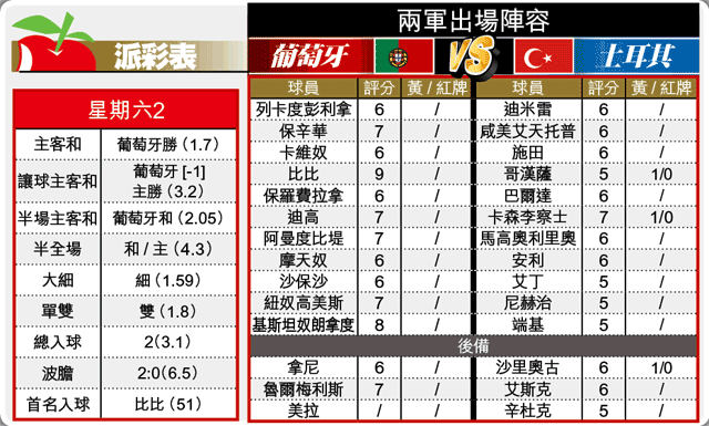 星期六2 A組 葡萄牙 2:0 土耳其 比比61'、魯爾梅利斯90+3' 入球者 /