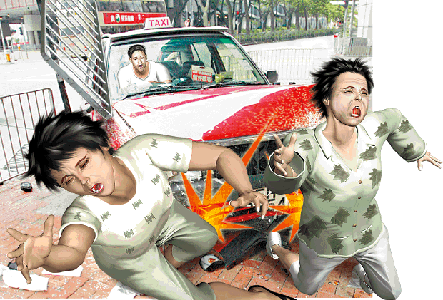 【本報訊】一名的士司機,昨晨疑酒後駕駛的士,空載沿尖沙嘴麼地道右轉漆咸道南時失控,先撞毀鐵欄及交通指示牌,繼而鏟上行人路,撞倒途經上址的主僕兩人,其中印傭左腳骨折重傷,同行僱主老婦則頭部受傷,雙雙倒卧血泊中,送院救治後印傭情況嚴重,肇事的士司機酒精呼氣測試高達42微克超標,涉酒後駕駛被捕帶署調查。