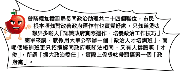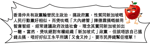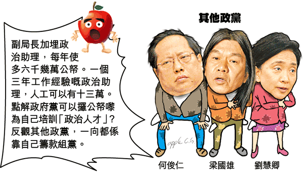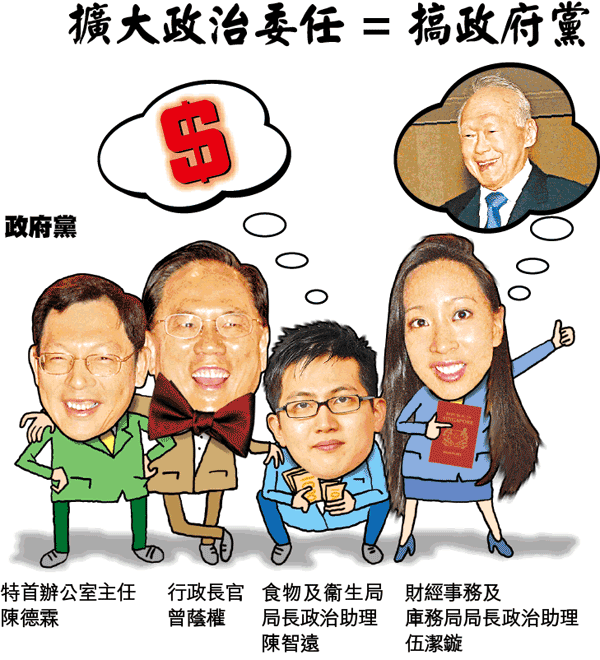 特首曾蔭權要透過擴大政治委任,組織類似新加坡人民行動黨嘅「政府黨」,已經係公開秘密,𠵱家搞到咁多風風雨雨,市民自然就要問:煲呔要搞新加坡式政黨冇問題,但點解要用市民嘅公帑嚟幫佢埋單呢?