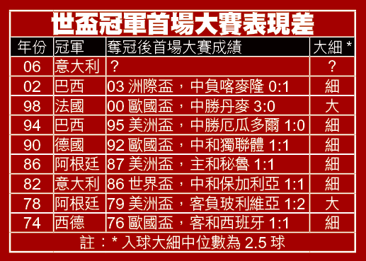 此外,世盃冠軍隊首場大賽,原來多是少入球,8場比賽開出2「大」6「細」(見附表),1:1更是大熱波膽;如認為荷蘭頂多在意大利身上取得1分,可考慮向此比數埋手。