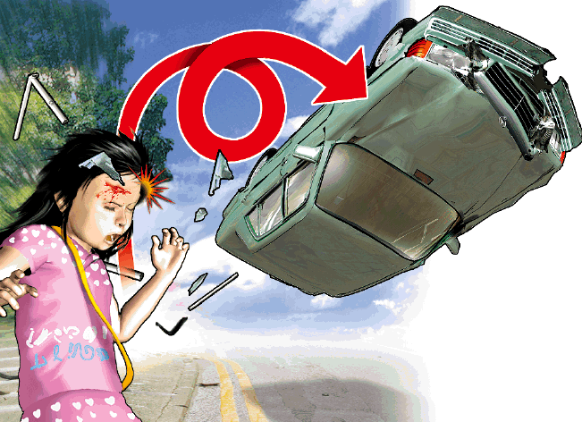 【本報訊】港島中區紅棉路昨午發生「炮彈飛車」驚險交通意外,一輛平治房車上山途中失控猛撞路邊梯級的斜石壆,並撞毀鐵欄及路牌,其後如炮彈般凌空飛起打轉,在15米外跌回地面,四輪朝天,車頭嚴重損毀,司機被困輕傷,要消防員救出;一名路經女童被碎片擊中受傷,報警後兩傷者獲送院。