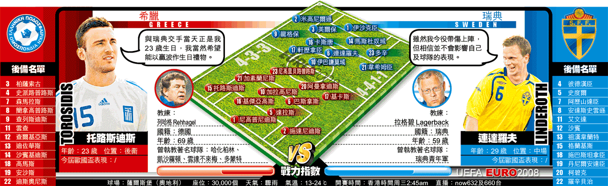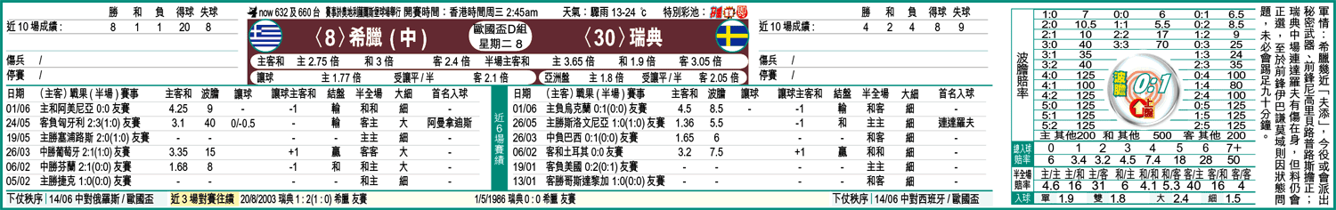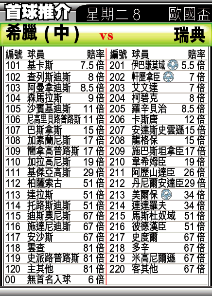 衞冕的希臘擅踢穩守突擊,周二於奧地利薩爾斯堡球場與瑞典進行歐國盃D組分組賽時,適逢瑞典的攻擊球員又各有隱憂,故此熱爆燈的入球「細」乃重心之選。(球賽編號:星期二8;now632及660台明日2:45am直播)