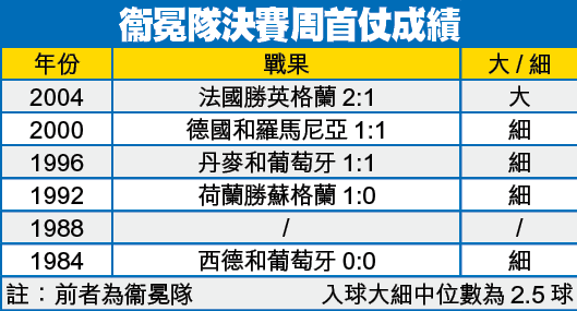 既然希臘防守好,瑞典前線則有隱憂,加上數據顯示歐國盃衞冕隊首戰多數少入球,5戰開出了1「大」4「細」(見附表),故今仗首選「細」,賠率雖熱至1.5倍,不過勝在穩陣,更可作為過關膽。另外,瑞典前線雖然有問題,惟論數糊能力始終仍在希臘之上,故個人較為看好他們可以全取3分,而「讓球」瑞典讓平/半,可小注上盤。