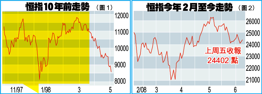 金融風暴發生咗10年,唔少人忘記唔到當年慘況,心水清嘅網友仲將10年前恒指走勢同近排嘅走勢比較,竟然發覺前段走勢差唔多,但10年前後段走勢一路跌(附圖1及2),擔心歷史會唔會重演?