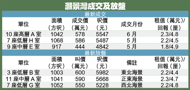 他續說,各期二手市價,大致按高低層享海景或園樓景作分野,是否望墳,對樓價影響不太明顯。現時約有330個放盤,園樓景呎價4800餘至5000餘元,海景戶則5200餘至6000餘元。
