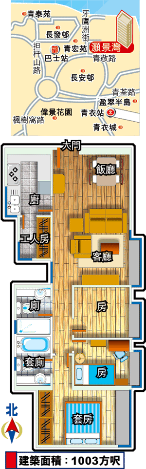 此戶尚有一個特點,就是長廳間隔,物業只有三期8至11座及一期1座C和D室屬長廳,對於喜歡間隔工整的買家別具吸引力,不過,物業其他單位的鑽石廳,則具備開揚和走廊位短的好處,長廳則如介紹的一伙逾千呎大戶,多屬一字形直廳,家具要靠一邊放,以便騰出通道,限制了佈置。幸物業實用率不低,介紹這伙扣除窗台後仍有75%,大廳夠闊,即使容納巨型梳化,仍有合理通道出入。