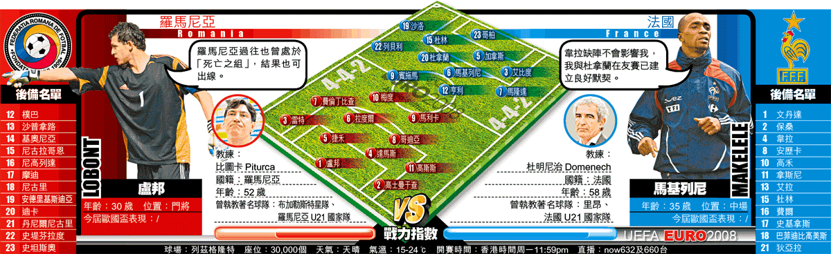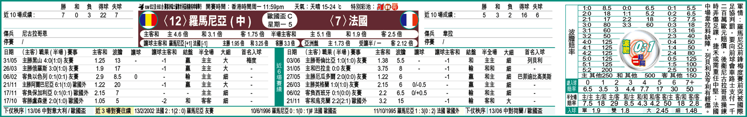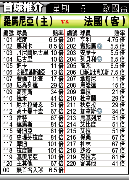 08歐國盃「死亡」C組周一進行首輪分組賽,羅馬尼亞與法國率先在瑞士蘇黎世列茲格隆特球場交鋒;法國近期雖然甚多傷兵消息傳出,但勝在後防仍然穩健,大賽經驗亦較羅軍優勝,1.75倍客W及1.48倍入球「細」可雙雙出擊。(球賽編號:星期一5;now632及660台今日11:59pm直播)