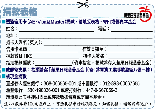 蘋果日報慈善基金接收捐款戶口 恒生銀行:368-006565-001 中國銀行:012-898-00067655 滙豐銀行:580-198836-001 渣打銀行:447-0-667059-3 蘋果日報慈善基金 電話:29908688 傳真:37112468 電郵:mailto:[email protected] 網址: http://charity.atnext.com 捐款: http://charity.atnext.com/forms