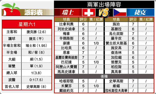 作為今屆歐國盃的揭幕戰,主辦國瑞士與捷克踢起上來較為保守,兩軍緊張有餘、刺激欠奉。瑞士於阿歷山大費爾傷出前是採取主動的一隊,並多次威脅捷克大門。 然而捷克下半場以史華高斯入替真高拿,前者把握瑞士一次後防犯錯一射中鵠,協助球隊旗開得勝。 好睇指數:★★ 註:以5★為最高