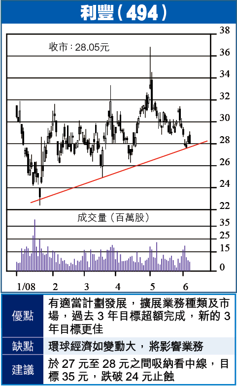 利豐現價28.05元,PE31.5倍,息率2.5厘,其增長雖非太強勁,但可保持穩定增長,可以候低吸納看中線。