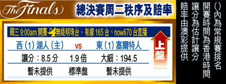 在「2-3-2」的賽制下,湖人在接着的3仗均佔主場之利。要知道這支西岸「1哥」在今季季後賽的主場表現出色,當中強如金塊、爵士及馬刺也得在史丹普中心球場俯首稱臣,反之塞爾特人的客途表現卻非常差劣;何況湖人在近8仗主場未嘗一敗外,平均所得的110分,更是平均只得85.9分的綠軍所望塵莫及,難怪博彩公司仍列湖人為1.75倍的奪冠大熱(綠軍1.95倍)。