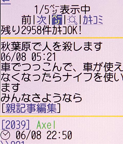 「我要在秋葉原殺人。用汽車撞人,車不能用就用刀。各位,再見了。」前日早上5時21分,加藤發出第一條留言。之後多條留言指自己頭痛無好轉,天雨來得不及時,「我慣了扮好人,人們真易受騙」、我在大人眼中是個好孩子」、「只有少數好友友誼長久」。6時31分說「時間到了,出發吧」。