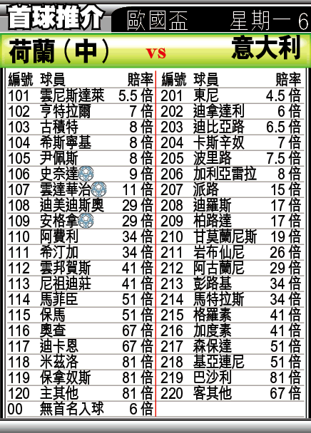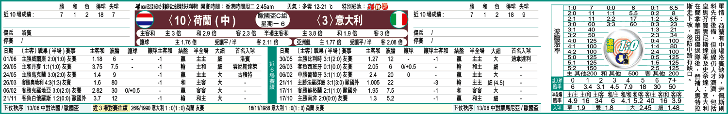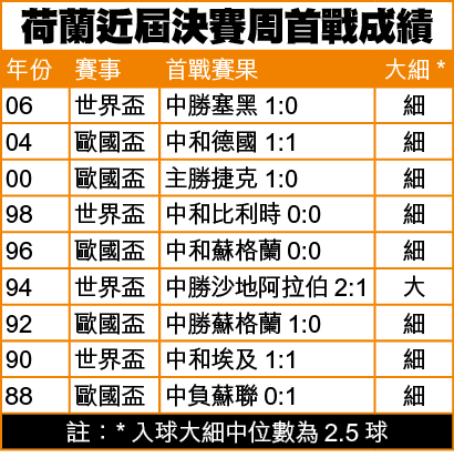 以往在大賽往往傳出內部不和的荷蘭,今屆一反常態,球員團結得很;單從他們之前的3場熱身賽,亦可感受到這支「橙軍」的決心。今仗面對一向在大賽慢熱的意大利,可說「合晒何尺」。而荷蘭近屆在決賽周首戰多能保不敗,且總入球多開「細」(見附表),球迷宜留意。