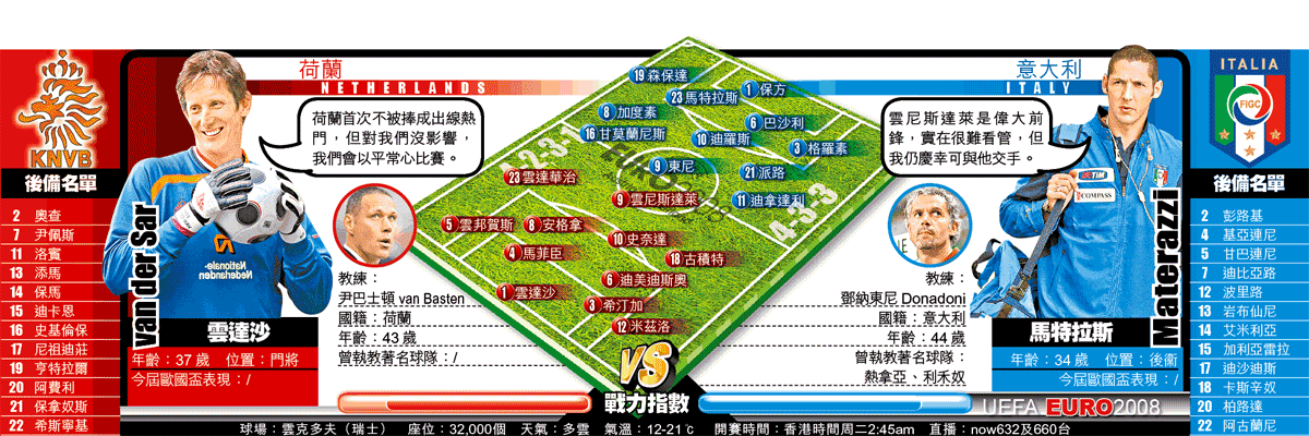此外,意大利前鋒東尼今季在拜仁慕尼黑「也文也武」,但德甲水準有幾高,大家心中有數;而鄧納東尼寧願保留「臭馬」卡斯辛奴,也不召用在大賽一向有運的恩沙基,亦屬敗筆。再者,意大利隊長兼中堅簡拿華路因傷退隊,對意大利打擊不少,由日走下坡的馬特拉斯夥拍質素平平的巴沙利扼守後防中路,實難予人信心,今役或讓荷蘭有機可乘。