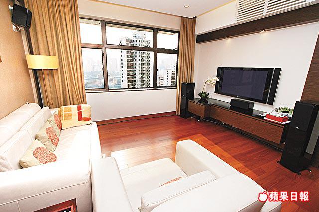 經過近百萬豪裝的放盤單位,面積1,313方呎,採3房2廳間隔(連1套房),另設有工人套房及儲物房,切合用家要求。單位間隔四正,配合85%實用率,地方更為見使。大廳呈長形設計,易於擺放家具,屋內主要使用啡、白色作配襯,感覺和諧自然。飯廳中央放有圓形餐桌,與天花的圓形燈槽營造統一視覺效果,旁邊鑲有入牆鏡面,空間感更見開揚。客廳則以兩組白色梳化作為焦點,佈置亦見講究。