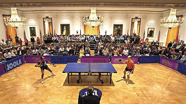 中國乒壇名宿梁戈亮,前天(周四)在美國加州尼克遜圖書館跟美國選手布雷斯威特(GeorgeBraithwaite)較量,但他們並不是爭奪任何獎項,而是重演37年前打開中美建交之門的「乒乓外交」的歷史性友誼賽,以便迎接北京奧運和明年中美建交30周年紀念。