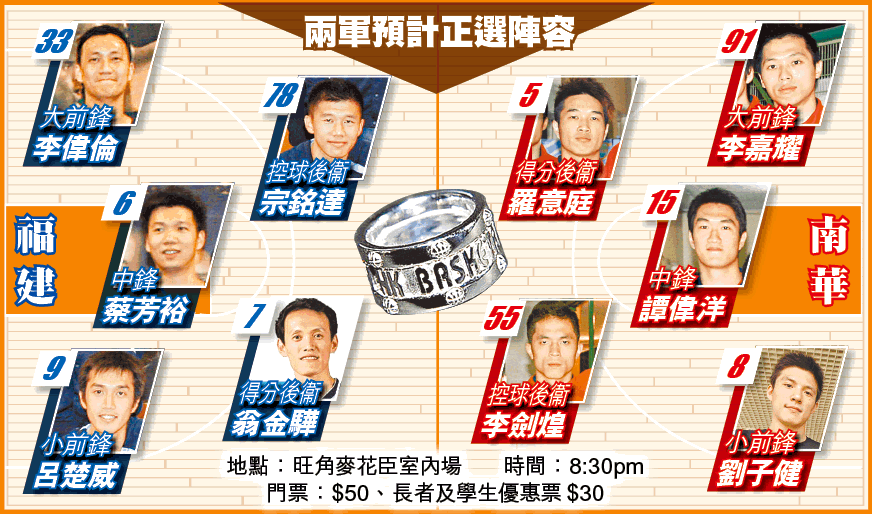 【本報訊】衞冕的永倫上周被福建以總場數2:1擯走,意味將今季甲一籃球總決賽將由其他球會奪得總冠軍指環。福建及南華將於今晚在旺角麥花臣室內場,進行5場3勝制的總決賽系列賽一決雌雄;而今場賽事的關鍵,莫過於在對永倫的賽事中發揮出「秘密武器」本色的福建前鋒鄭錦興。