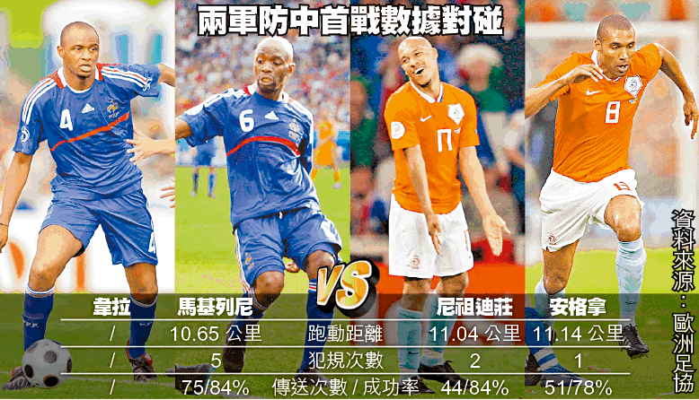 雖然法國後衞加拿斯豪言對荷蘭搶攻,不過在「高手過招」的大賽中,防守為主是球隊的先決條件,而「得中場」更是「得天下」。適逢法國有韋拉復出夥拍馬基列尼,兩軍在中場以一對硬淨的防中互撼,將會是今場賽事的一大亮點。