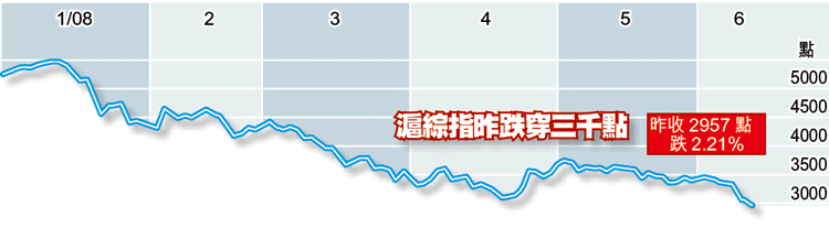 市場熱盼的救市政策未見蹤影,內地散戶以至機構投資者,終於按捺不住沽貨抗議。作為內地股市指標的上海綜合指數,其三千點「政策底」昨日一試即穿,收市跌2.21%報2957點,連跌7日之餘,更創近15個月以來新低。 記者:黃武榮
